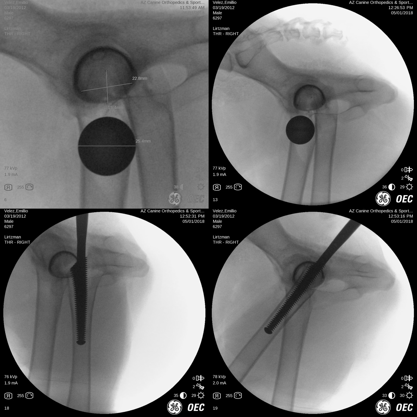The most commonly used prostheses at Arizona Canine Orthopedics are called “uncemented” and has many of the same design features found in hip replacements used in people. “Cemented” implants are held in place with an acrylic but there may be break down of the interface between the cement and bone over time. Porous-coated, uncemented implants become stable by ingrowth of bone into their beaded surface in the first few weeks to months after implantation. This bond is more likely to last the life of the dog.